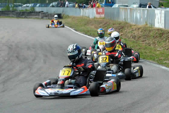 Einige Fahrer im Pulk. Im Hintergrund kann man erkennen, wie ein Fahrer mit seiner Hand die Luftzufuhr zum Vergaser abdeckt, umd das Treibstoff-Gemisch "fetter" zu machen.