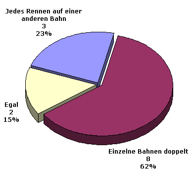 | Kommentare: "Jedes Rennen auf einer anderen Kartbahn. Dann müssen wir eben testen!!!!!" (Marco Senftleben) "Nach Möglichkeit jedes Rennen auf einer anderen Kartbahn. Man sollte allerdings in betracht ziehen, die Bahn in die andere Richtung gefahren als andere Strecke zu betrachten." (Eduard Mengel) "Manche Kartbahnen doppelt - nicht unbedingt aber anders wird's kaum funktionieren (bei von mir gewünschten 8 Rennen)" (Volker Busche) "Am liebsten wäre es mir, jedes Rennen auf einer anderen Bahn auszutragen, dies dürfte aber in der Praxis kaum umsetzbar sein (zu wenig Auswahl an guten Kartbahnen). Bevor ich auf einer Scheiß-Bahn fahre, fahre ich lieber eine gute zweimal." (Michael Gärtner) "Jedes Rennen auf einer anderen Kartbahn, wobei ein oder zwei Doppelungen absolut legitim wären. Im besten Fall bei beliebten und guten Bahnen." (Milan Pesl) "zB. eine Kartbahn einmal In-/ und einmal In-/Outdoor fahren." (Stefanie Bollmann) |